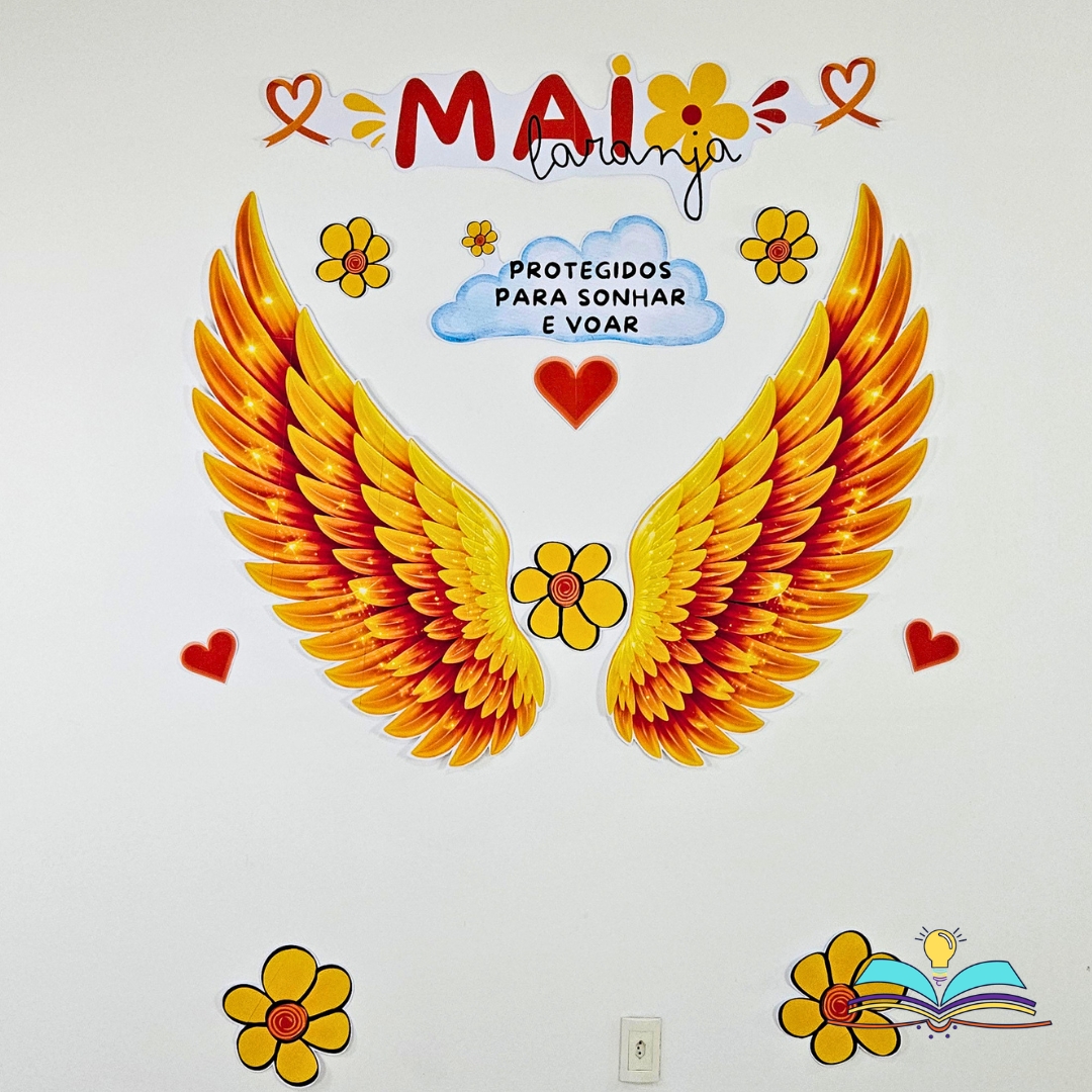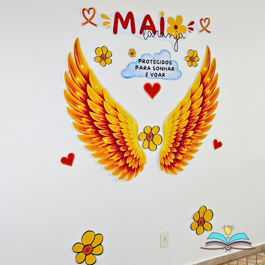 🔸Painel Asas com o tema Maio Laranja, uma homenagem visual para conscientizar, acolher e fortalecer a proteção infantil.