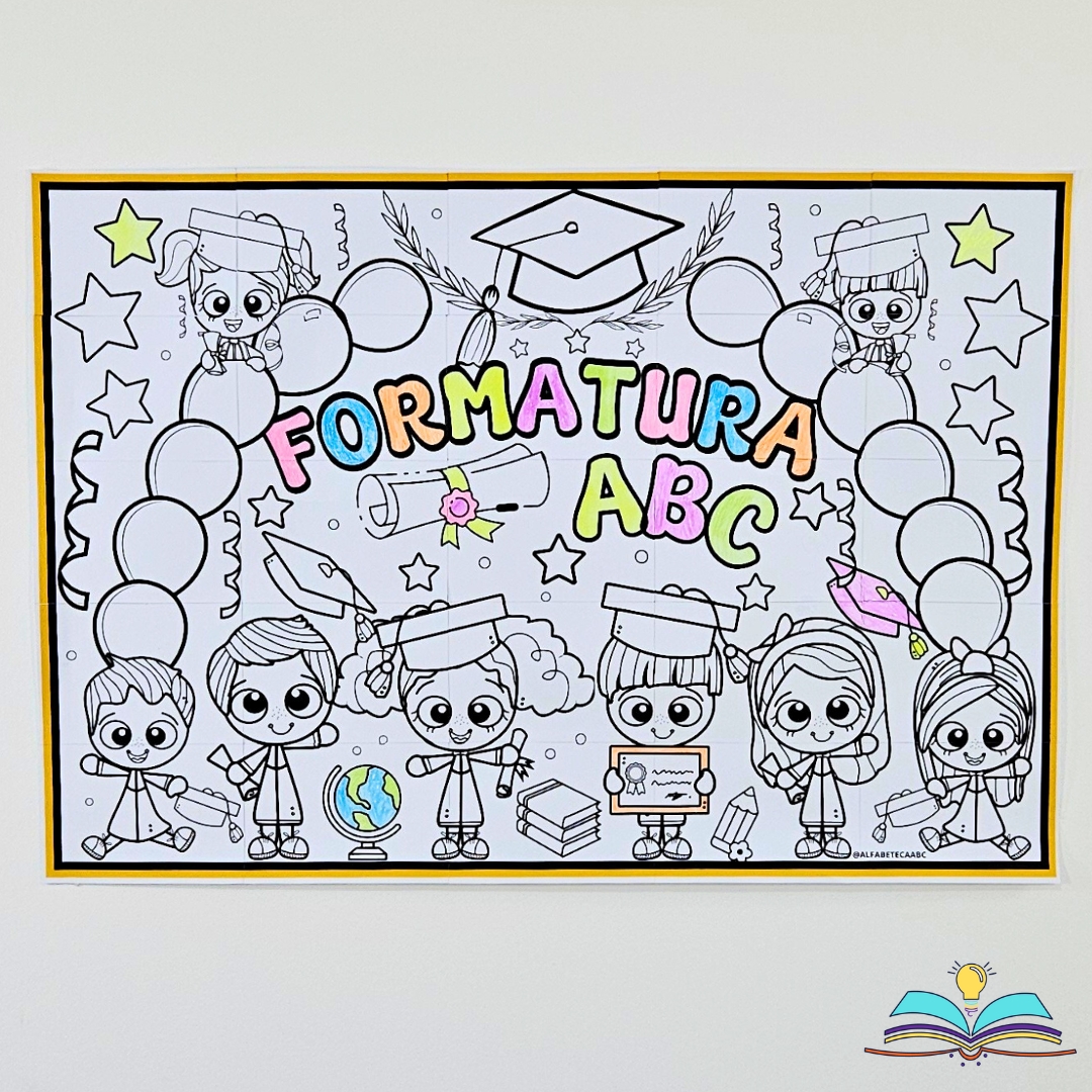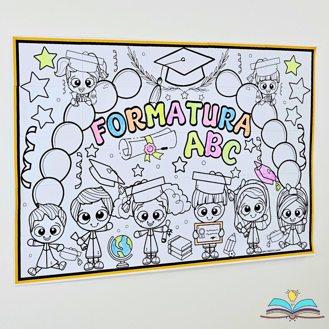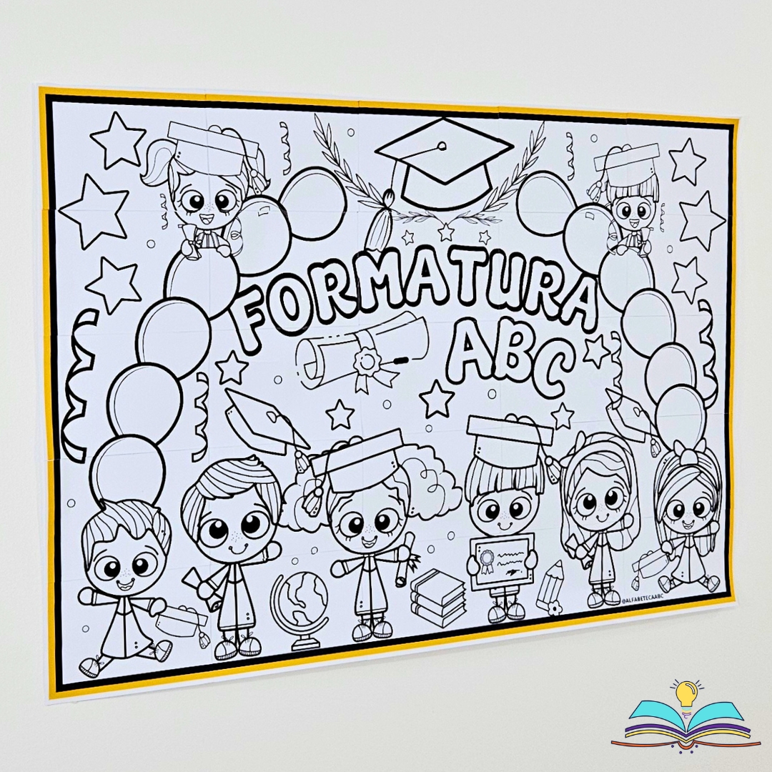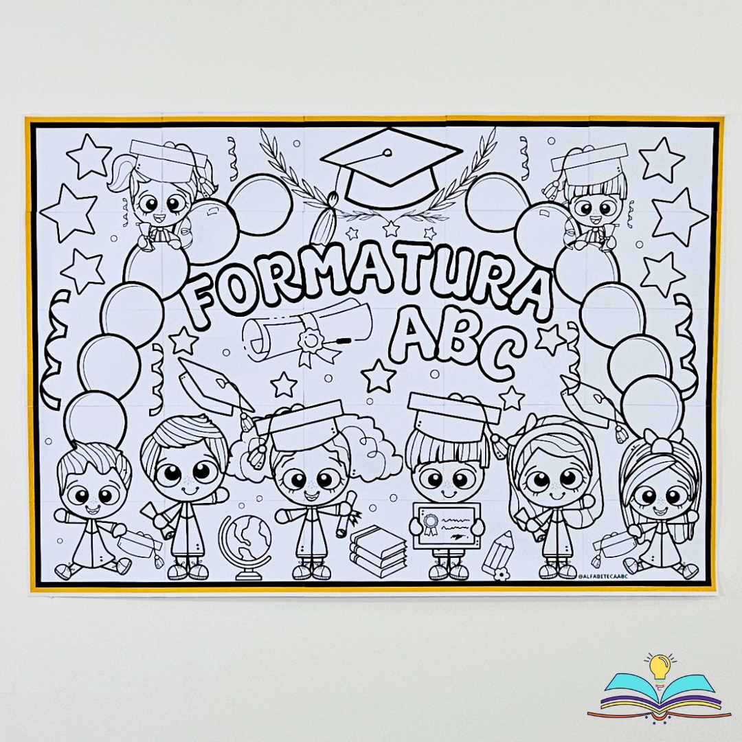 🔸Painel preto e branco para pintura coletiva temático de formatura infantil.
