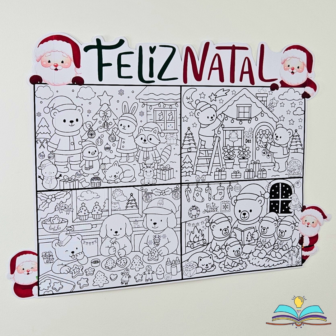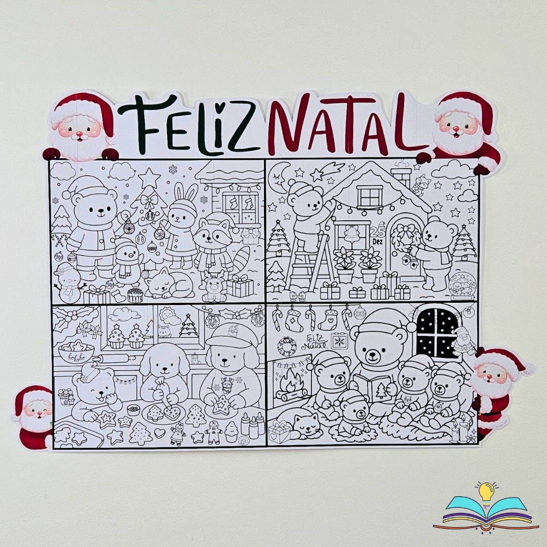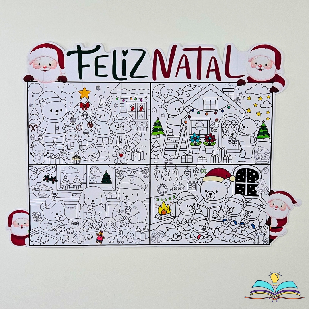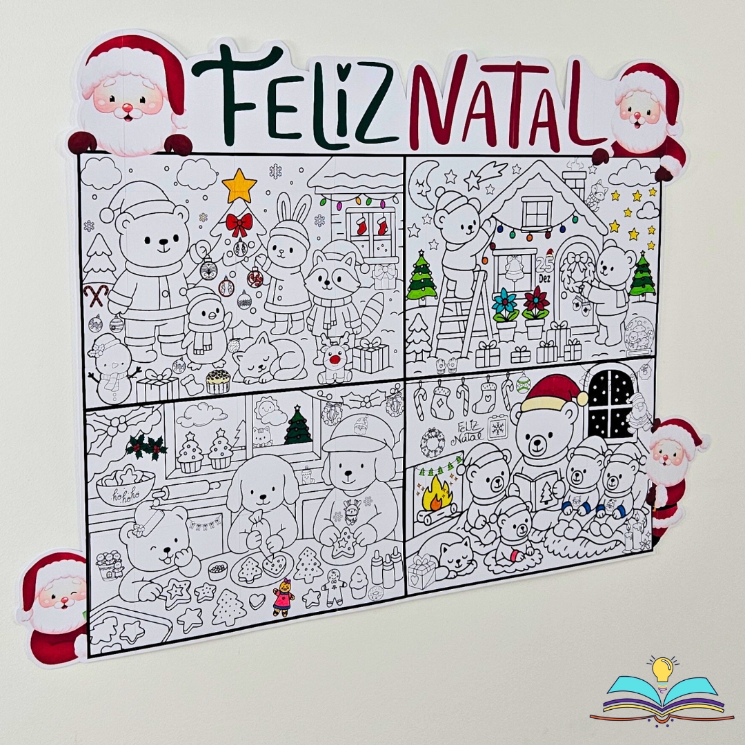 🔸Painel preto e branco para pintura coletiva temático de natal com as figuras inspirada nos personagens Bobbie Goods. Celebrado em 25 de dezembro.